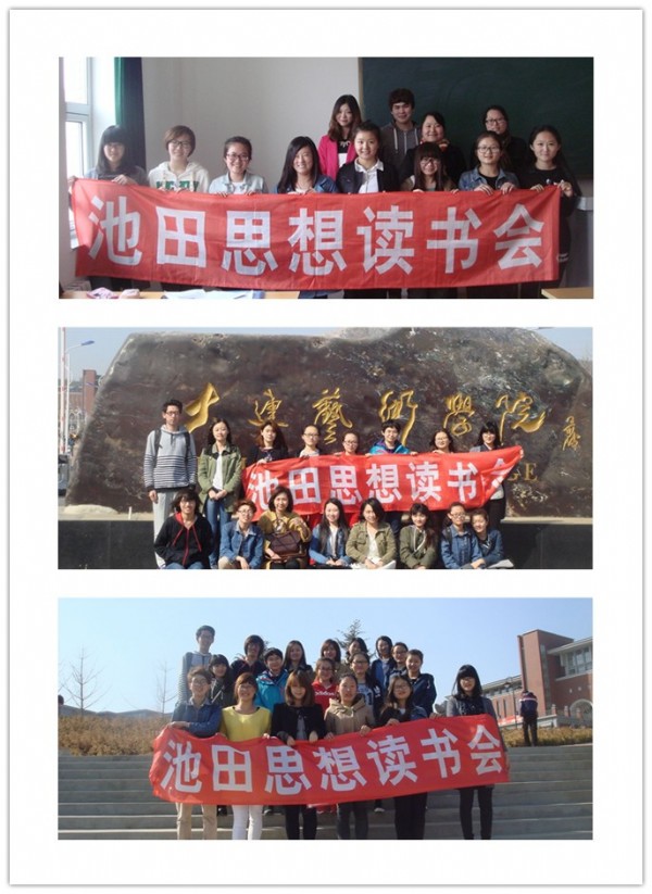AC米兰官方网站大学生社团“池田思想读书会”在学院社团联合会的正确领导下,在学院各级领导的关怀下,以“池田大作教育思想研究所”为依托,于2013年11月22日成立了。此后,指导教师-AC米兰官方网站的李丹、潘红艳老师与日语及日播专业的43名社员们齐心协力,本着“以人为本”、“志在实践”的宗旨,开展了各种各样有意义而卓有成效的活动。每次活动,无论是指导教师还是社员,都从中受到了锻炼与启发。通过“探寻池田大作的内心世界”、学唱歌曲“樱花缘”及诗歌朗诵、参加“创价学会艺术代表团”欢迎仪式、“池田大作思想研究所”成立揭牌仪式、艺术文化交流晚会、参加由大连中日教育文化交流协会副秘书长刘爱君教授主讲的“池田大作与中日友好”为题的学术报告会等活动,社员们能够把池田思想与自身联系起来,与专业紧密结合,拓宽了人文领域视野。他们决心,通过研读池田先生的著作,认识自我、树立正确的人生目标,开拓创新、理论结合实践,勇于进取、创造有价值的人生,成为促进中日友好及建设世界和平的继承者与传播者。